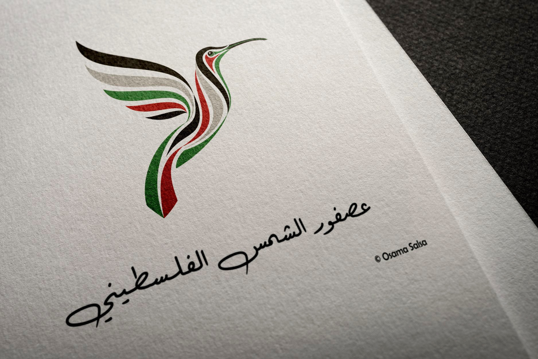 The logo transforms عصفور الشمس into a fluid, ribbon-like form — where the body, wings, and tail of the hummingbird are woven from the four colors of the Palestinian flag: black, white, green, and red.
