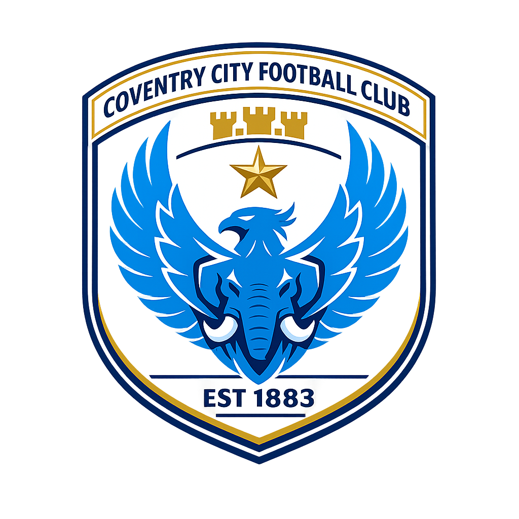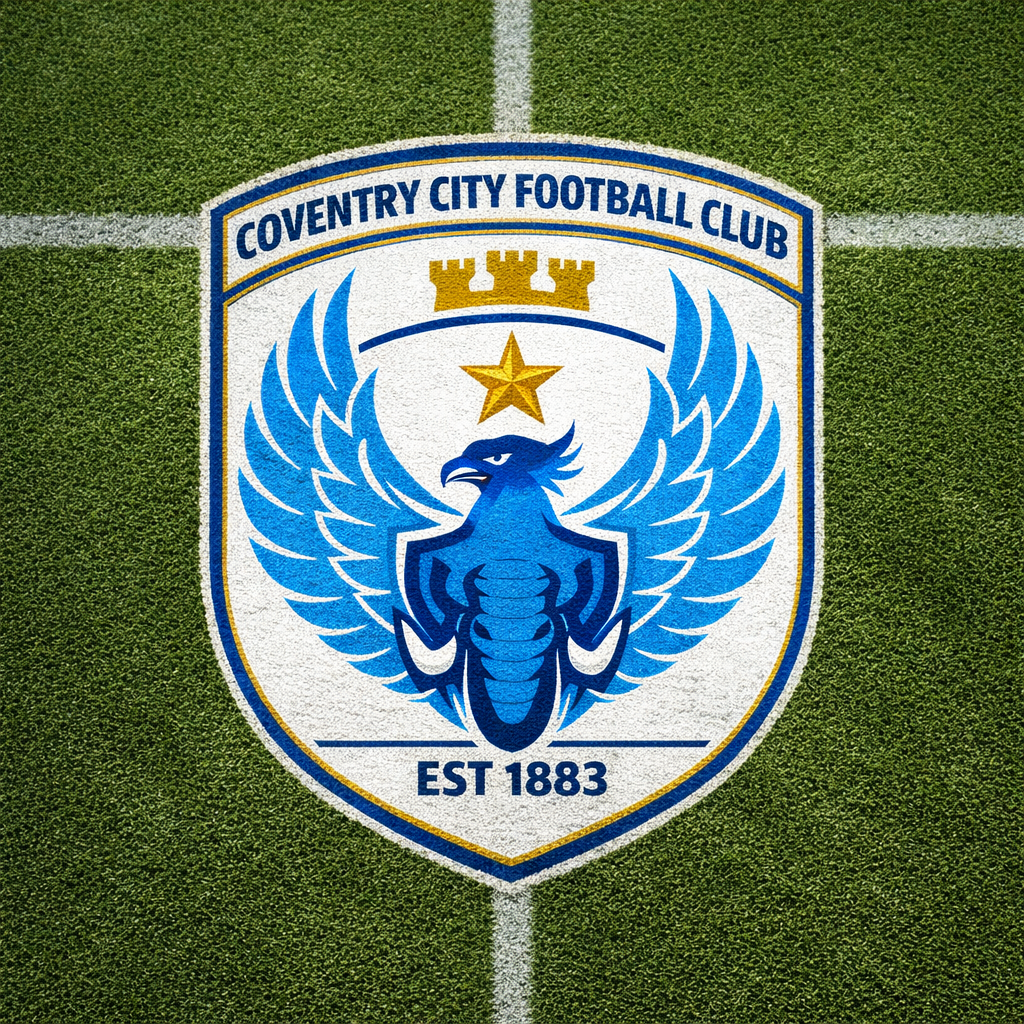 - THE PHOENIX The centrepiece — a majestic phoenix rising with wings spread upward. It represents Coventry's legendary ability to rise from the ashes, most notably after the devastating Blitz of 1940 and the club's own journey through the football leagues.
