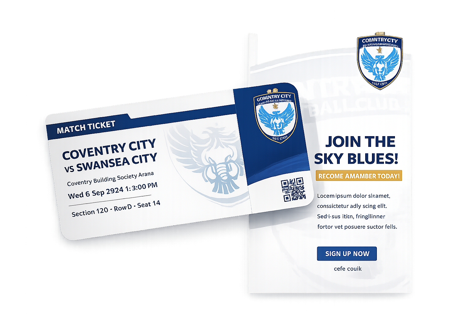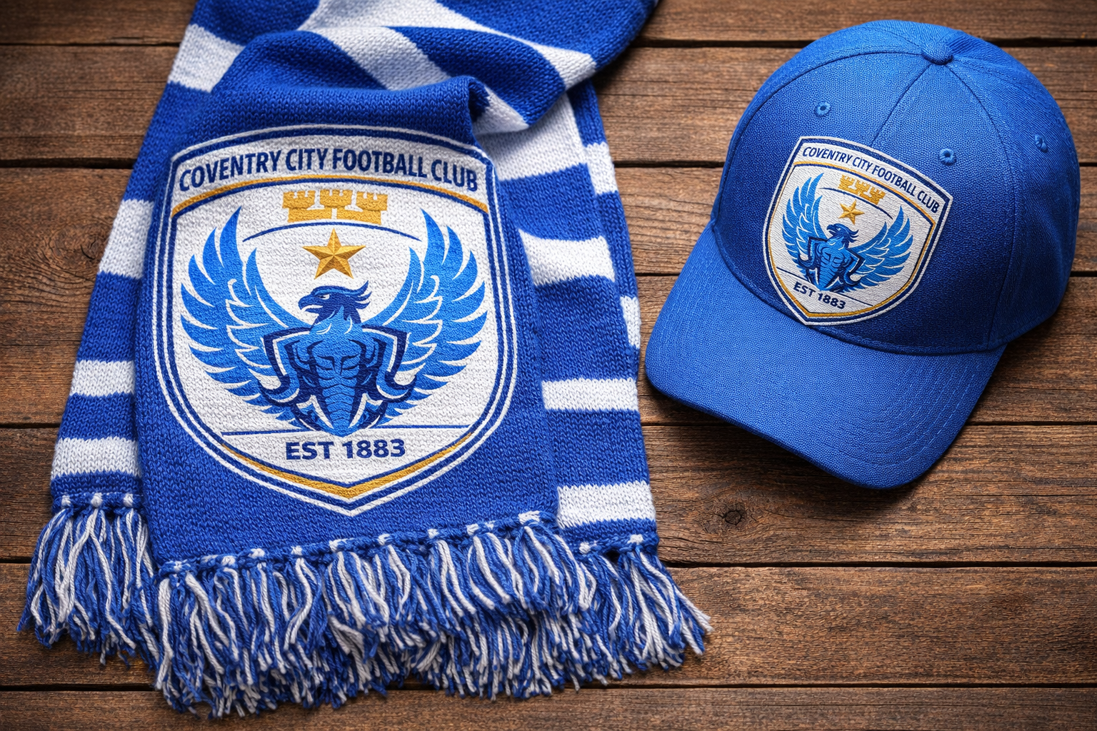 A crest must live beyond the screen. Below are mockups showing how the new Coventry City emblem performs across real-world touchpoints — from matchday kits and scarves to digital platforms and stadium signage.